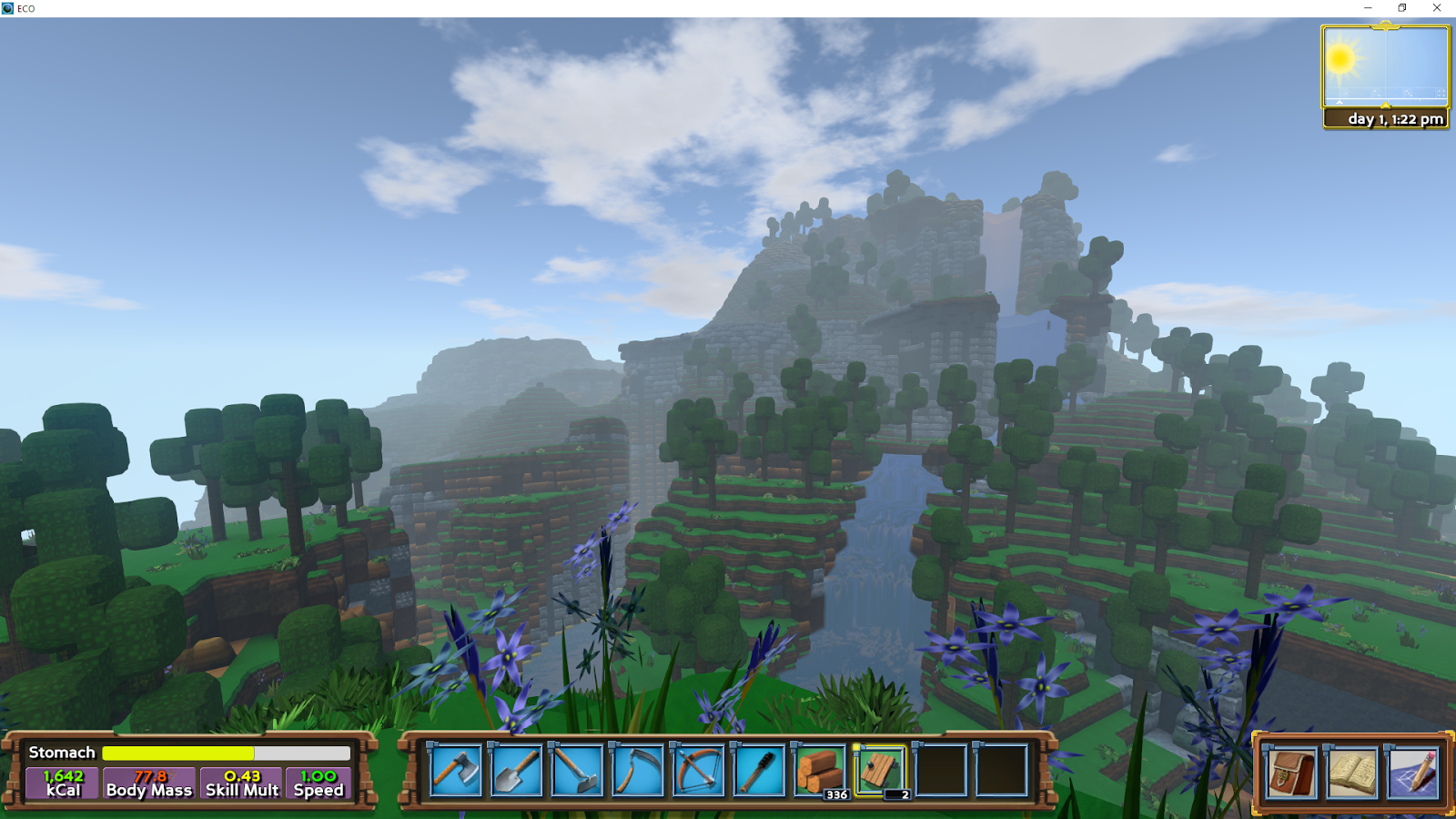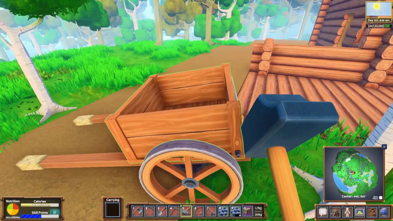 In the left bottom corner you can find a nutrition bar and your skill tree. By clicking on the small number you can open up a skill tree, which you will need for building and crafting to survive. Choose a tool from your skill tree to start harvesting materials for eating food, building houses etc.
