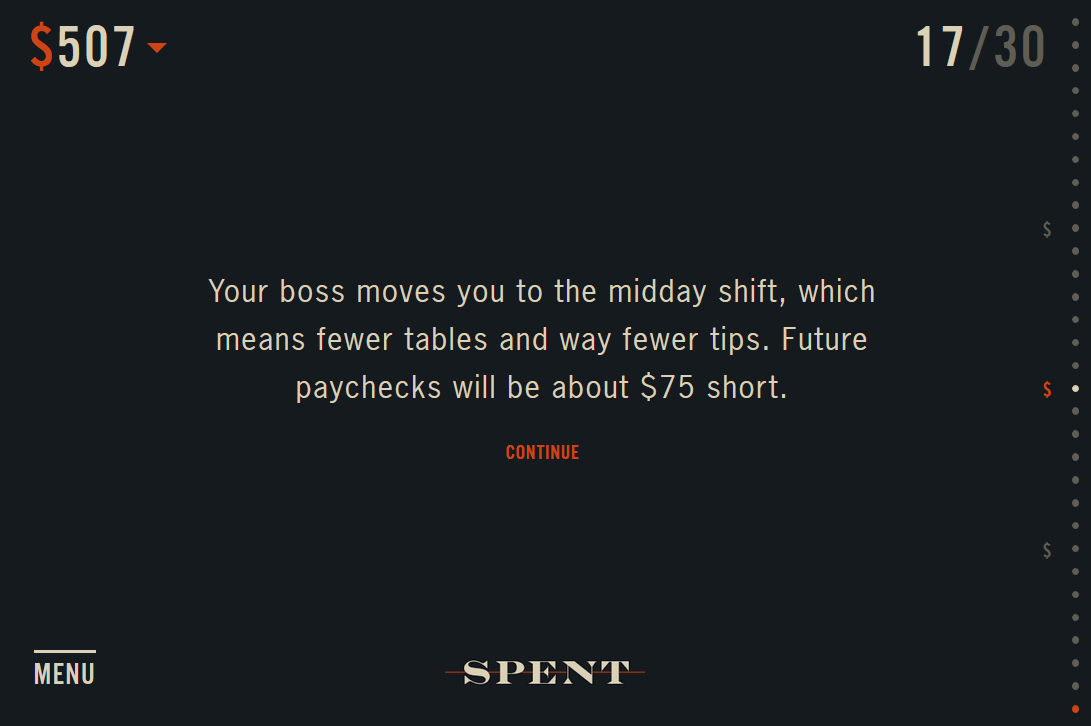 Throughout the game’s one-month period, the player faces dilemmas which reveal how quickly changes in employment, housing, medical costs and other expenses can have disastrous consequences for normal people.