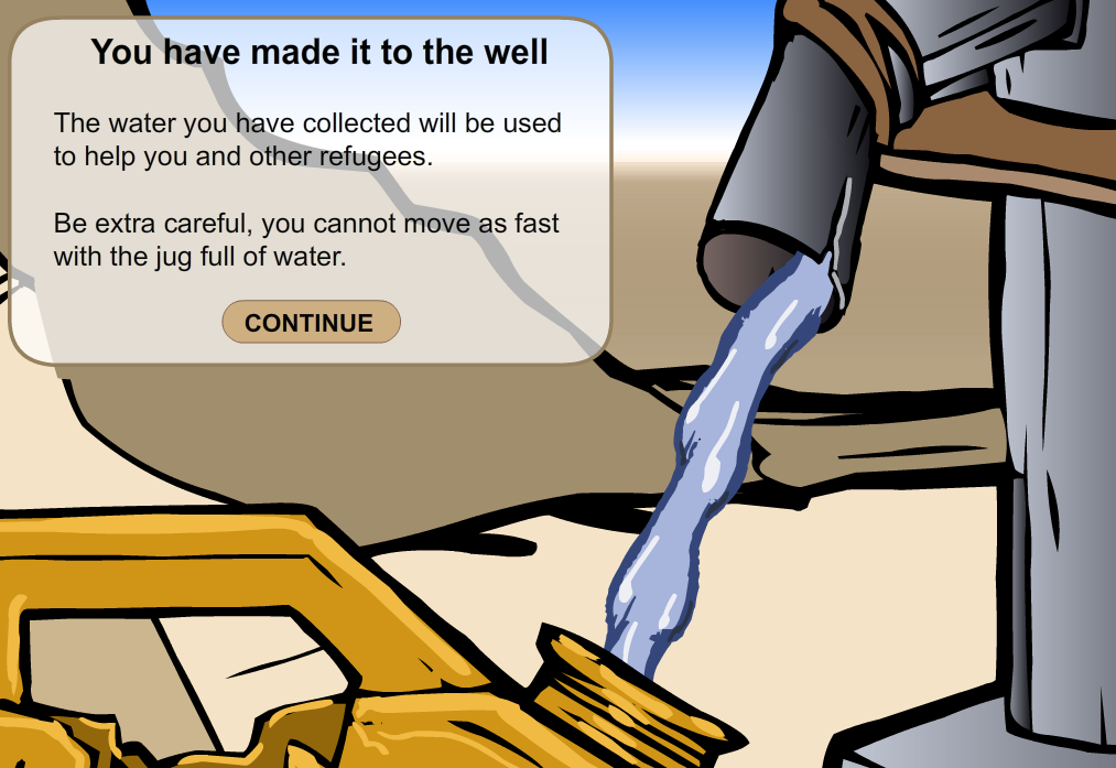 A player chooses an avatar and forages the water to help other refugees in a refugee camp. Avoiding militia’s cars is necessary.